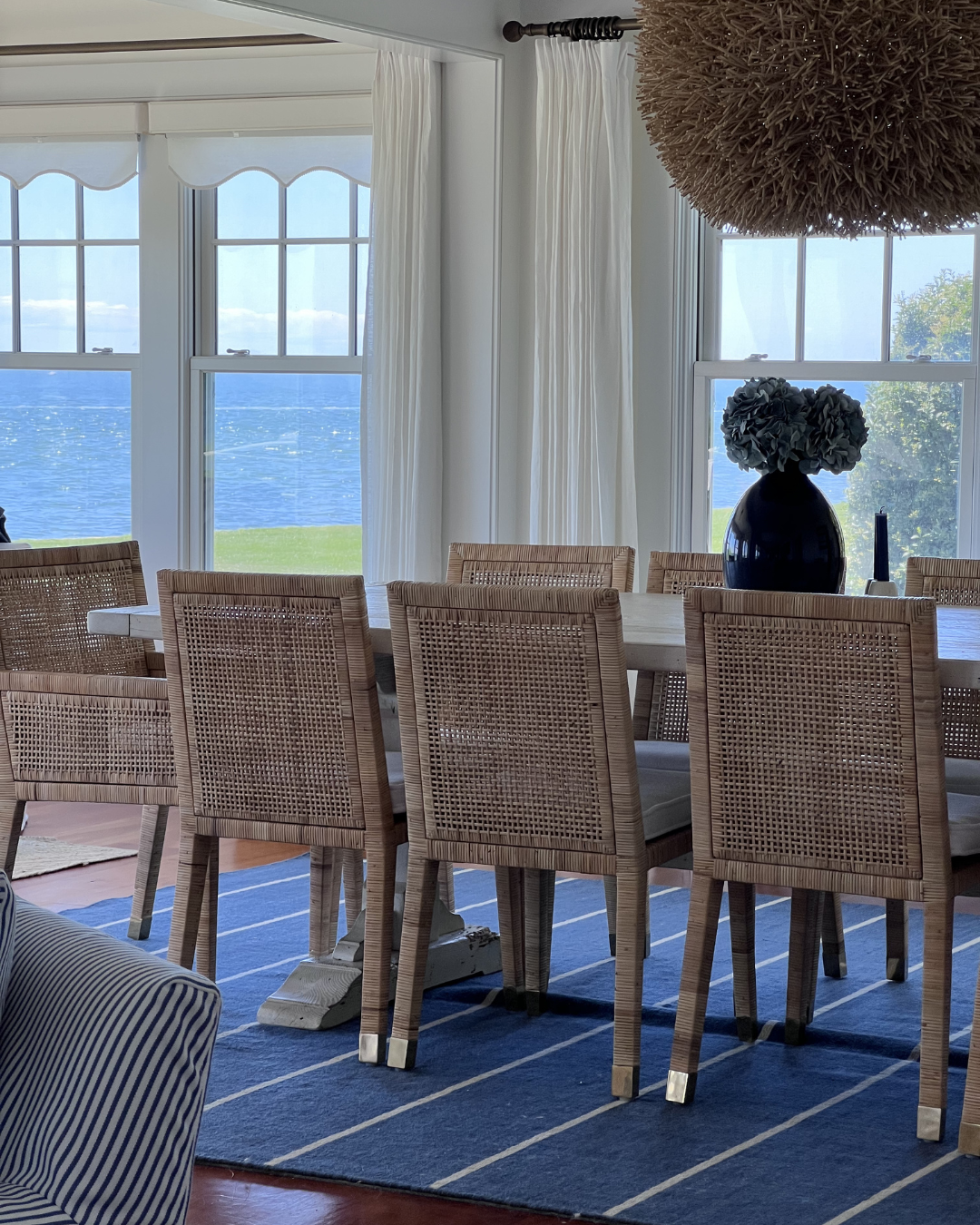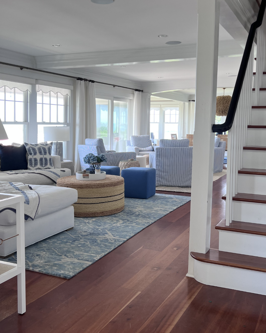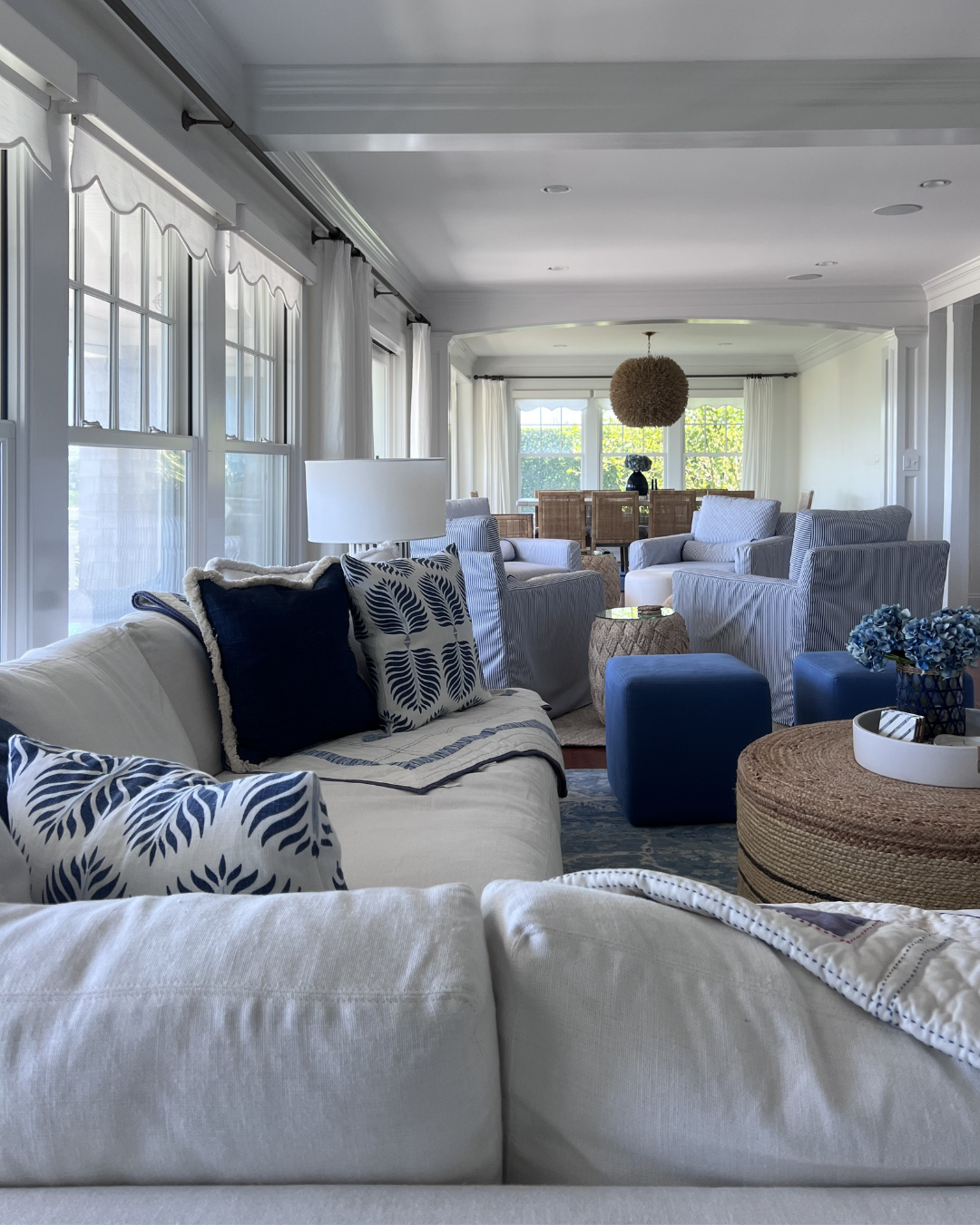 Portside: Great Room Mar 5 Written By Chelsea Wade Inside Portside, a whole-home design project inside a casual coastal contemporary home on Long Island Sound.TOUR PORTSIDE Before + In-Progress Shop Portside: Great Room Amelia Hand-Knotted Rug Banyan Table Lamp Norfolk L-Sectional Jaden Side Table Bar Harbor Bone Inlay Table Lamp Brynlee Woven Ottoman Harrison Swivel Cube Naturals Tobago Vero Rug, White Summit Swivel Chair Bena Stool Cos Cob Stripe Wool Rug Balboa Rattan Side Chair Balboa Rattan Armchair Siena Flushmount Summit Swivel Chair St Tropez Stool Bowden Pillow Cover Granada Pillow Cover Perennials Pinstripe Pillow Cover Harrison Round Stool Porcupine Pendant Light Belgian Flax Linen Curtains Devon Floor Lamp Cabot Console SHOP ALL Projects Chelsea Wade