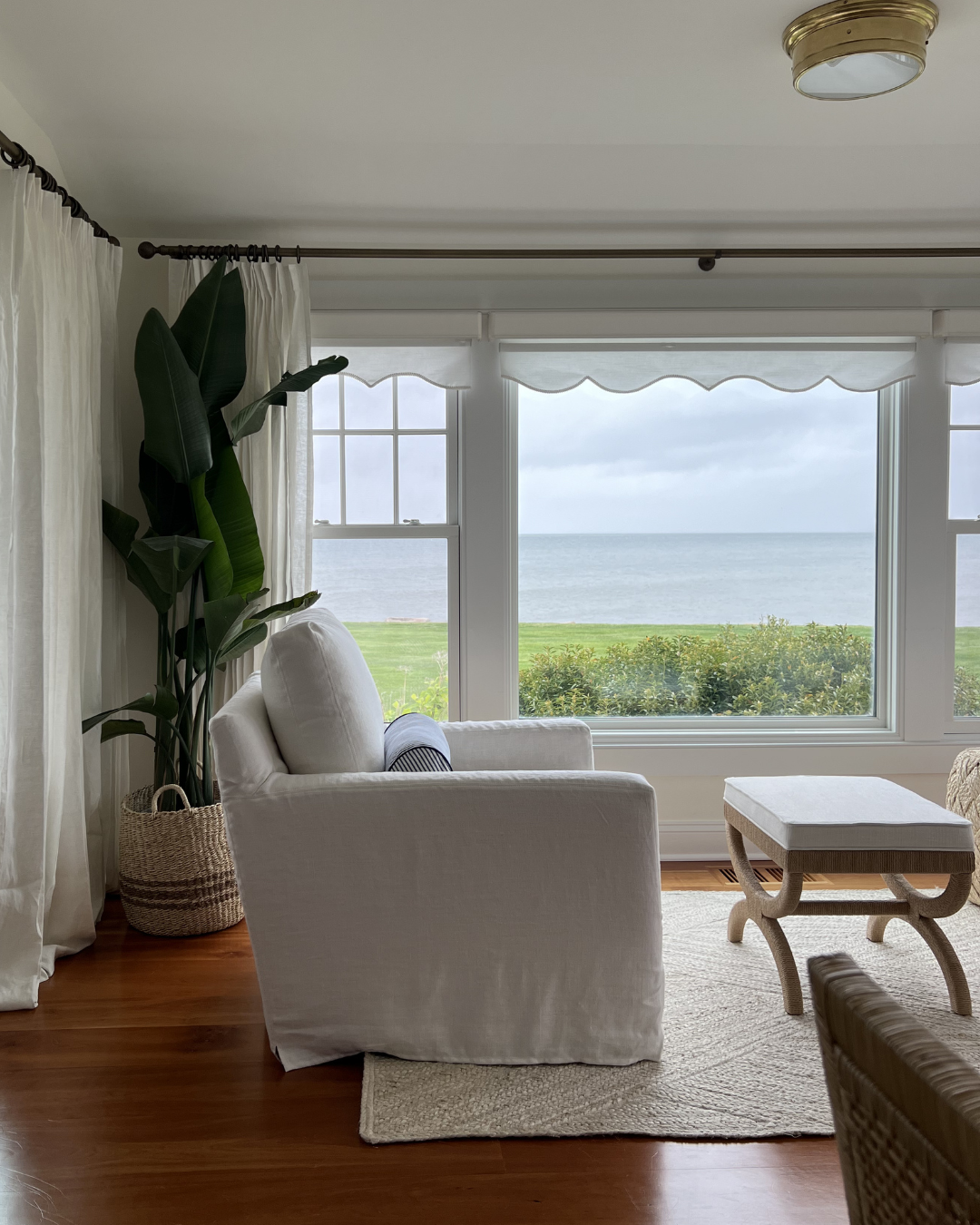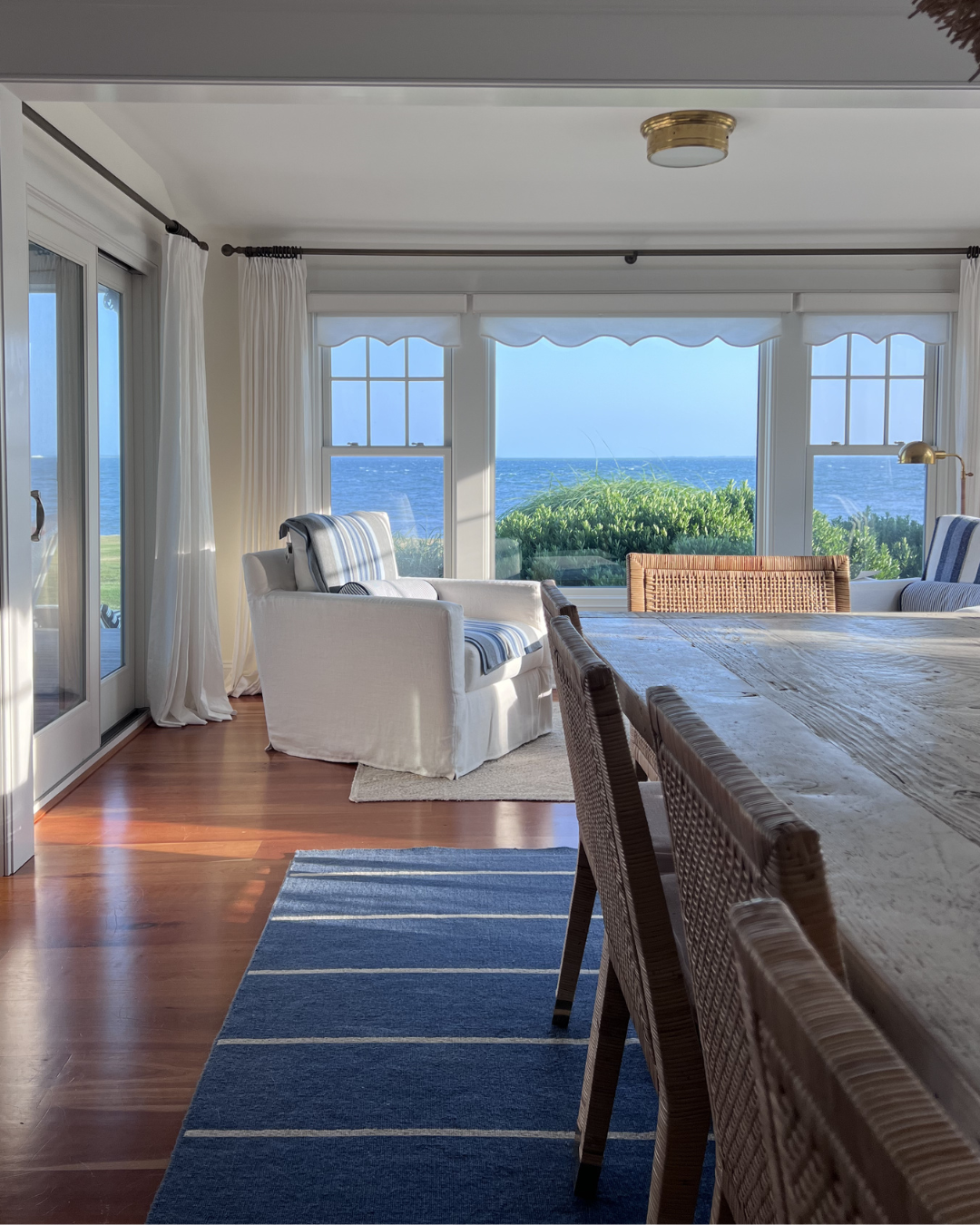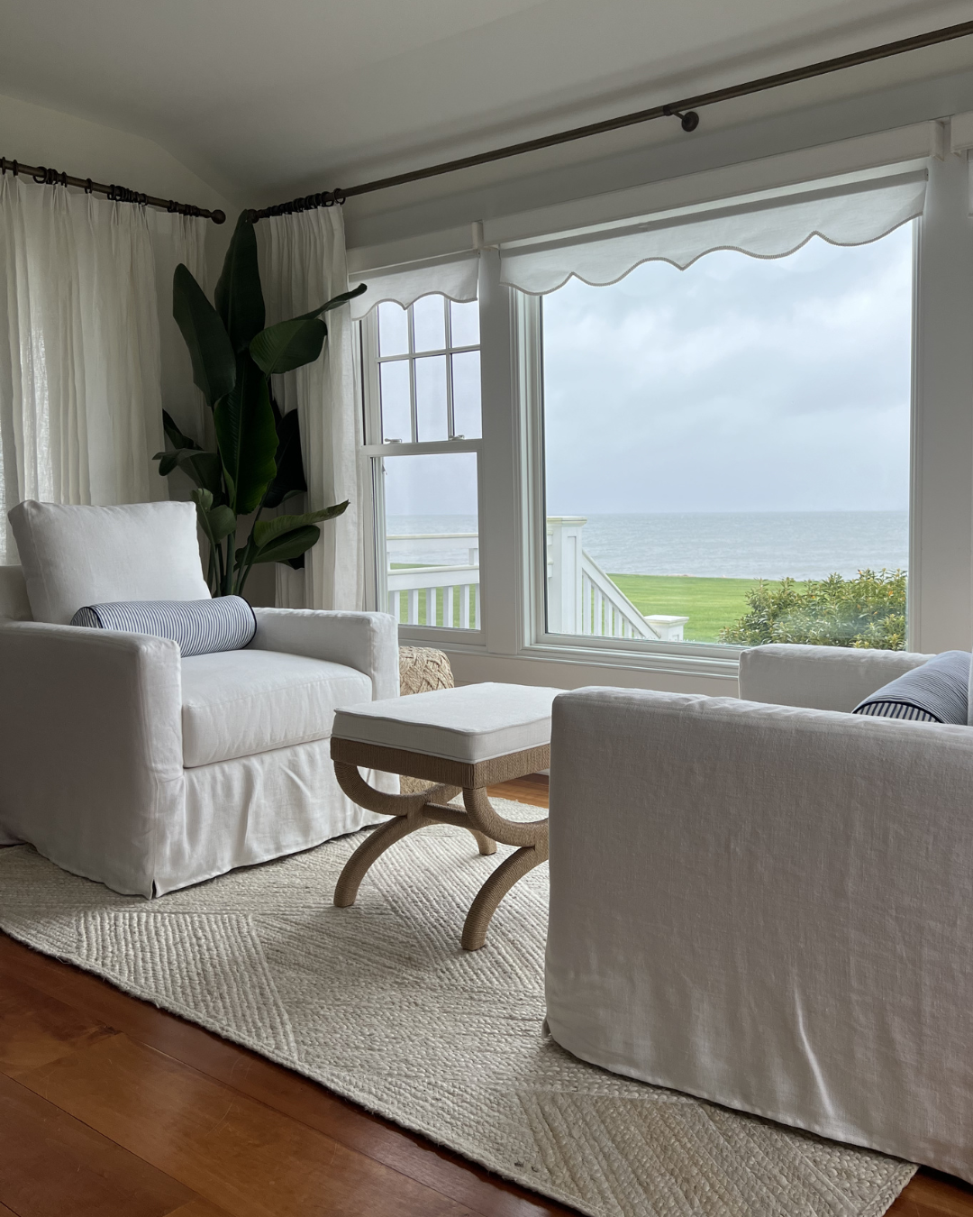 Portside: Great Room Mar 5 Written By Chelsea Wade Inside Portside, a whole-home design project inside a casual coastal contemporary home on Long Island Sound.TOUR PORTSIDE Before + In-Progress Shop Portside: Great Room Amelia Hand-Knotted Rug Banyan Table Lamp Norfolk L-Sectional Jaden Side Table Bar Harbor Bone Inlay Table Lamp Brynlee Woven Ottoman Harrison Swivel Cube Naturals Tobago Vero Rug, White Summit Swivel Chair Bena Stool Cos Cob Stripe Wool Rug Balboa Rattan Side Chair Balboa Rattan Armchair Siena Flushmount Summit Swivel Chair St Tropez Stool Bowden Pillow Cover Granada Pillow Cover Perennials Pinstripe Pillow Cover Harrison Round Stool Porcupine Pendant Light Belgian Flax Linen Curtains Devon Floor Lamp Cabot Console SHOP ALL Projects Chelsea Wade
