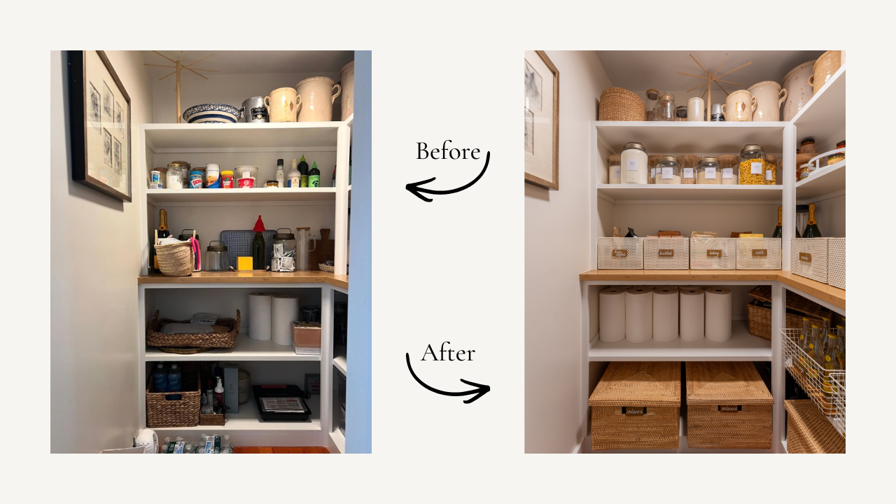 To get organized, you’ll take everything out, wipe down the shelves, discard expired food, and then put items back in an optimized layout with supportive organizing materials/products. This helps you see exactly what you have, avoid buying duplicates, and makes breakfast, lunch and dinner so much easier moving forward.